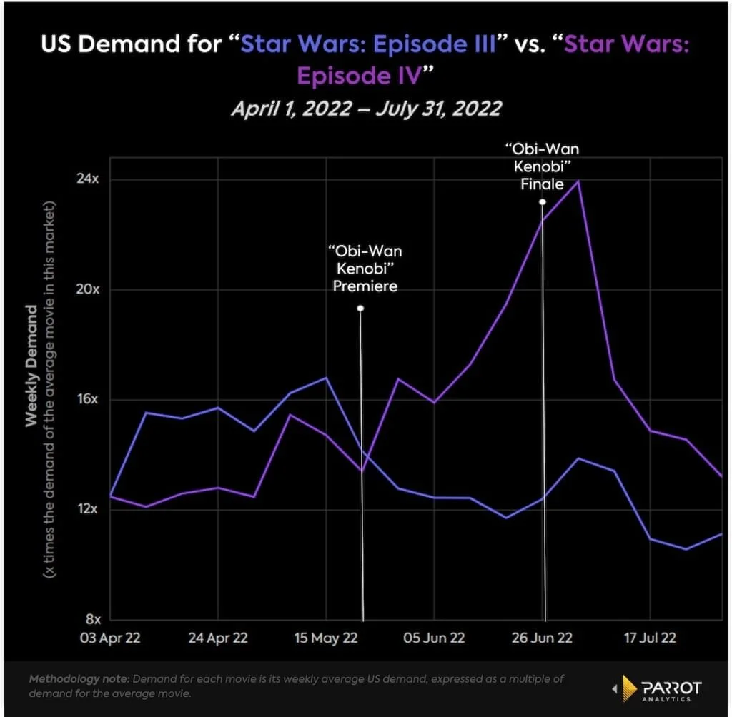 Spin-offs and prequels are not just a strategy to keep franchise viewers on streaming services – these programs also drive interest in the source material. Data from Parrot Analytics shows how Disney+’s Obi-Wan Kenobi kept audience demand high on previous Star Wars films – even after the series finale.