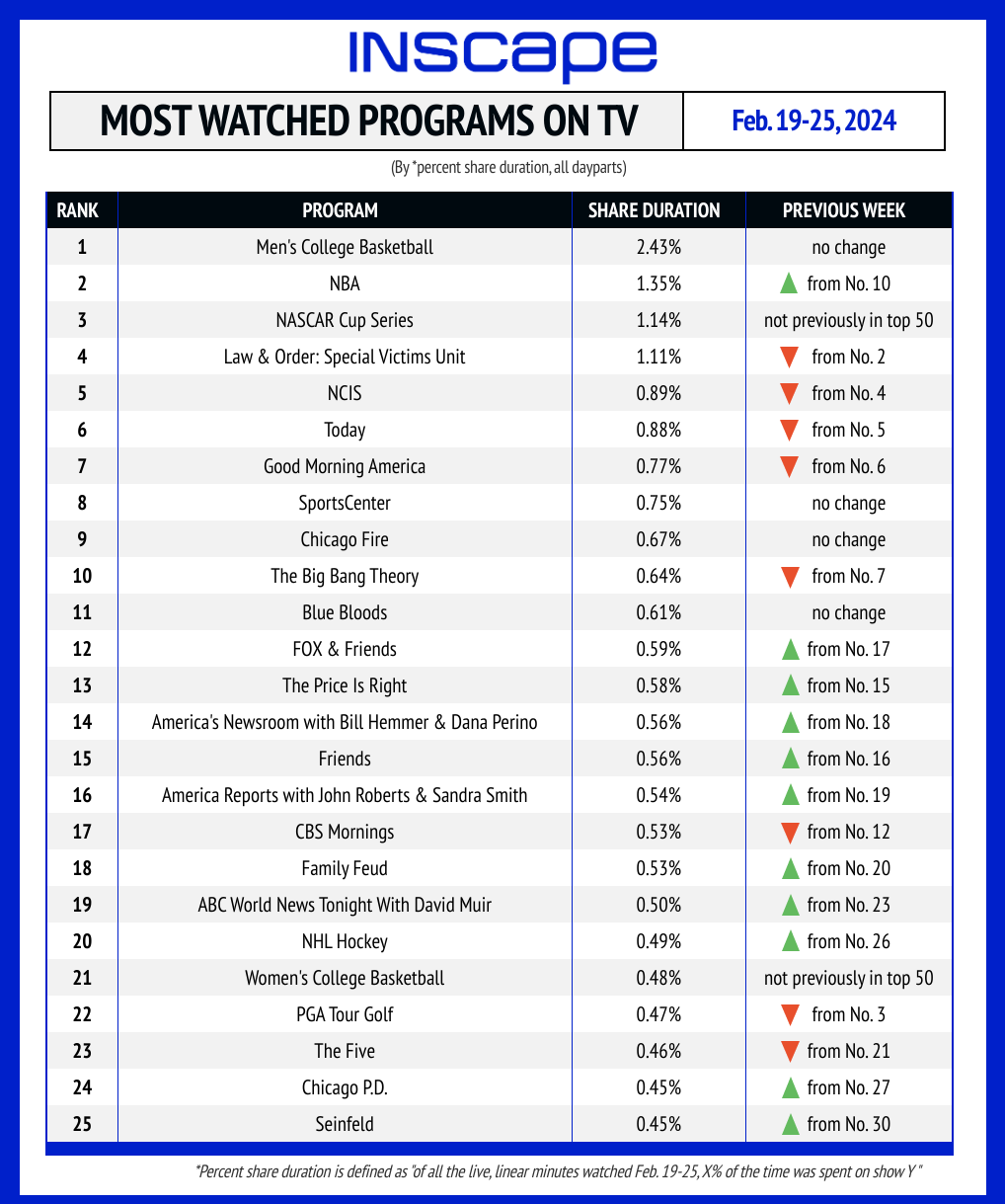 Welcome to our weekly snapshot of TV by the numbers, highlighting the most-watched shows and networks for February 19-25, with insights from Inscape, the currency-grade smart TV ACR data provider and data technology division of Vizio. Data is linear, live TV only and includes all episode types (new and reruns). Rankings are by percent share duration (i.e., time spent watching).