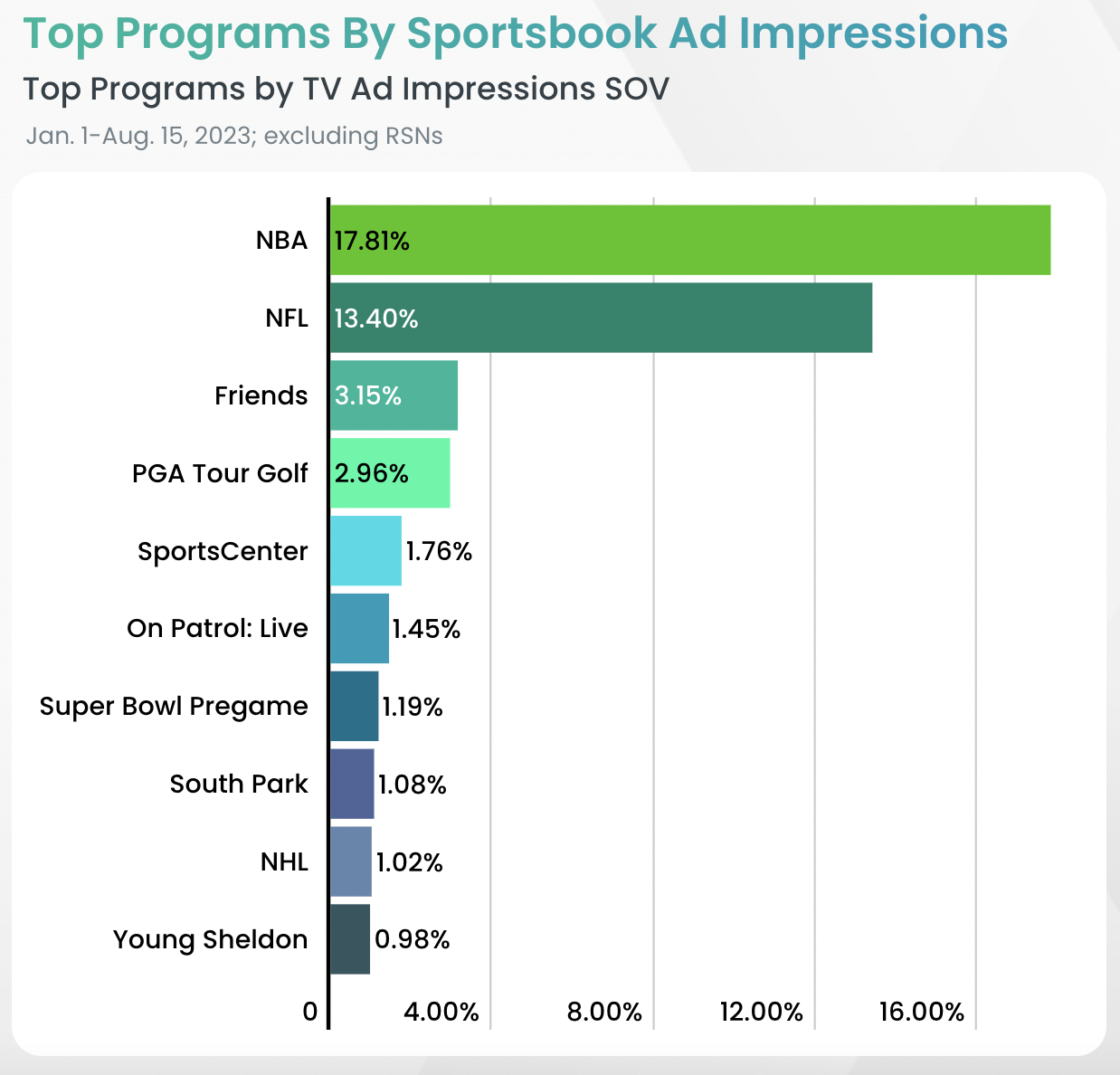 Perhaps as a response to repeated calls of there being too many betting ads — particularly during games — top brands in the space have aimed to diversify the programming where ad buys occur. For instance, while the NBA and NFL have still led the way for sportsbook TV ad impressions so far, you’ll also find programs like Friends, On Patrol: Live and South Park high on the list, with considerable jumps compared to last year.