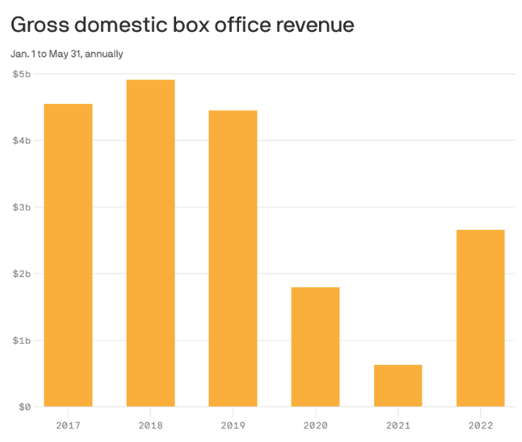 Top Gun: Maverick has logged the biggest Memorial Day opening weekend ever as audiences flocked to theaters for the action-packed nostalgia trip. It’s not rescuing this year’s box office on its own, though, as this Axios chart shows while utilizing Box Office Mojo data.