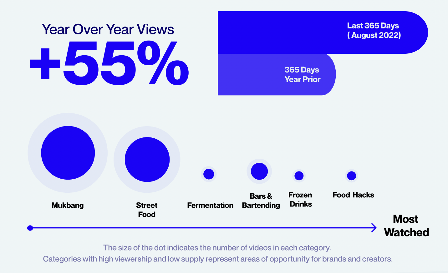 As indicated above, food & beverage content viewership climbed 55% on social video over the last year — this despite a declining demand for at-home recipes and cocktails (you may remember the early pandemic bread craze…).