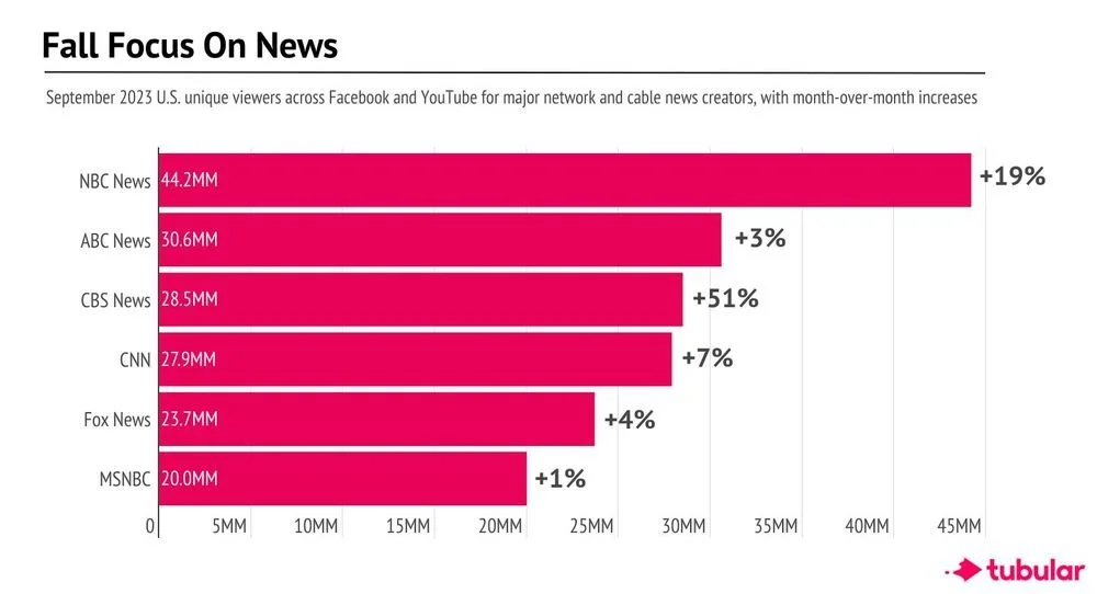 This isn’t an HBO series or a remake of Idiocracy, it’s October 2023 where TV News spikes the ratings, serving an average age that is approaching 70 and FOX News runs the table. Not so in YouTube and Facebook where younger viewers are giving network news a “thumb bump” on social video.