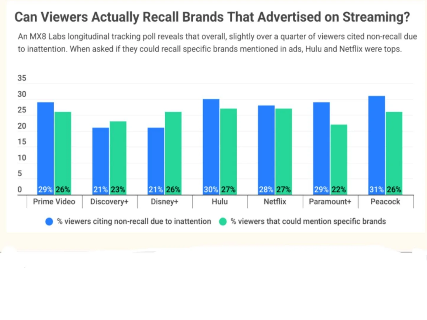 For advertisers, the study found that about one-quarter of viewers said they weren’t able to recall ads because of inattention. Disney+ was tops among the subscription services, with only 21% of its viewers saying they couldn’t remember which brands advertised while they watched.