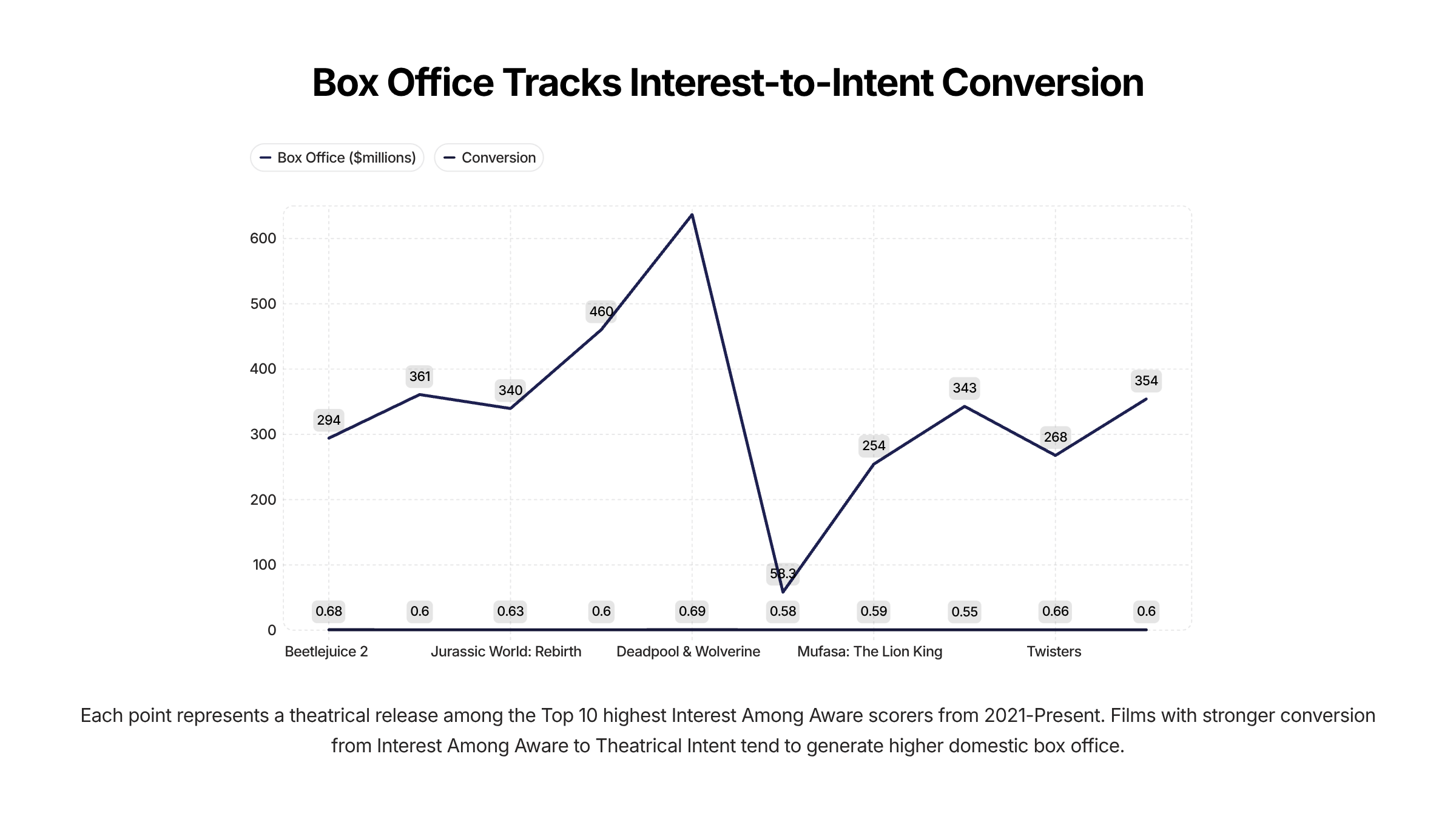 To explore this, I looked at the top 10 theatrical films in Interest Among Aware from 2021 to the present, according to Greenlight Analytics, and compared those scores with their Theatrical Intent (those planning to see a movie in theaters) and final domestic box office revenue. The goal was simple: understand whether conversion is a more meaningful driver of success than raw interest alone.