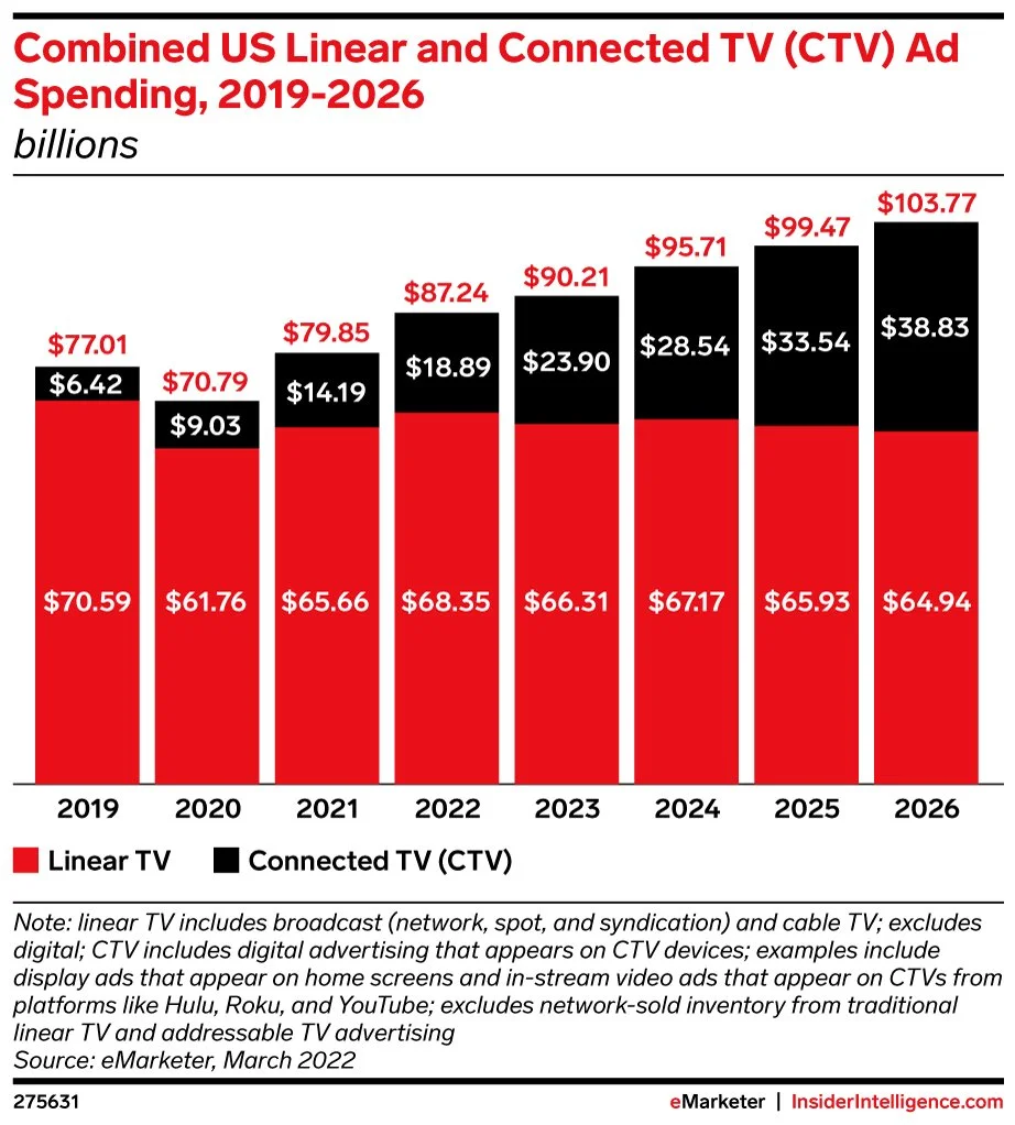 The death of linear TV has been greatly exaggerated. If we look at eMarketer data from March 2022, what we actually see is a slight uptick for linear TV from last year, and small single-digit percent year-over-year variances predicted through 2026.