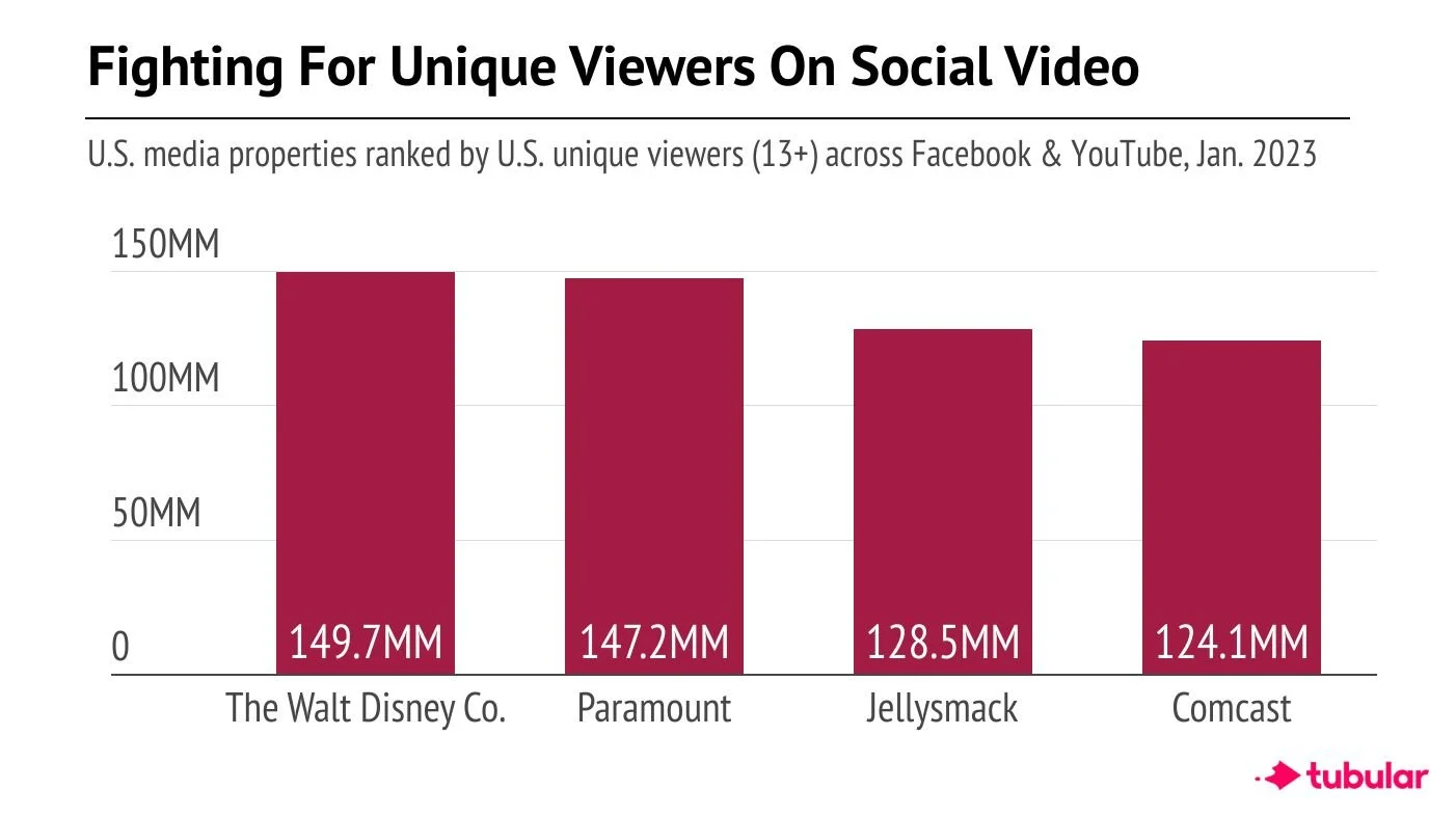 Major media companies’ war for viewer attention is fought across multiple fronts, including social video. Tubular Audience Ratings data for Jan. 2023 showed that the Walt Disney Co. edged out Paramount – by unique U.S. Facebook and YouTube viewers – for the first time since last March. Disney’s 149.7 million unique viewers was its highest total in the last year, fueled in part by Avatar and Ant-Man hype. Also of note: