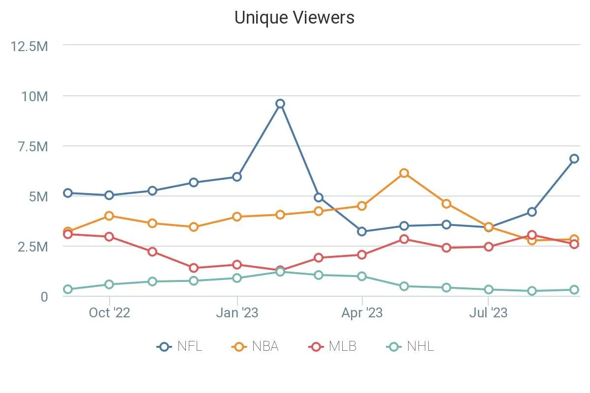 The chart above, from Tubular Labs, shows a monthly look at unique U.S. viewers aged 13-to-24 for the four major leagues across Facebook and YouTube. Even at their peak, those numbers are not very high (for instance, fewer than 10 million unique people watched the NFL in February, its best month).