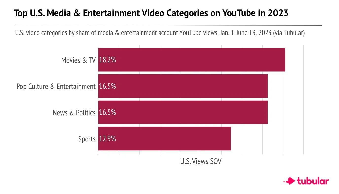 Doubt that Netflix’s younger-than-linear audience is as interested in sports? Tubular Labs data shows that sports has accounted for nearly 13% of U.S. media and entertainment views on YouTube so far this year.