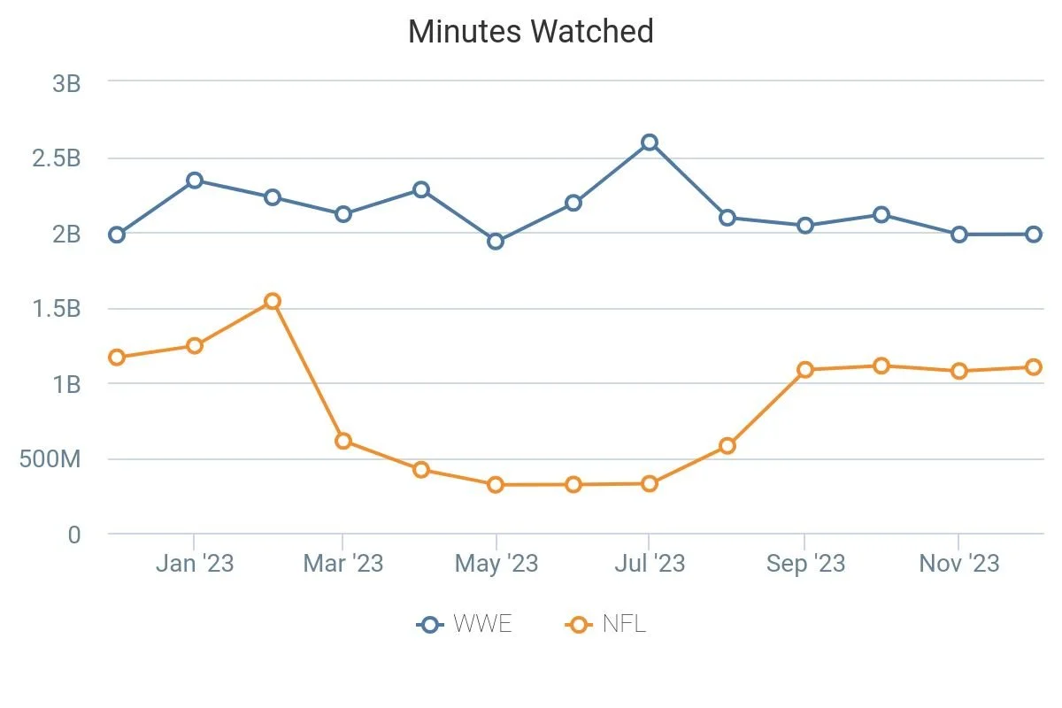 But from a watch-time perspective, the WWE was No. 1 by far, with 2 billion minutes watched across YouTube and Facebook (nearly double the NFL at 1.1 billion).