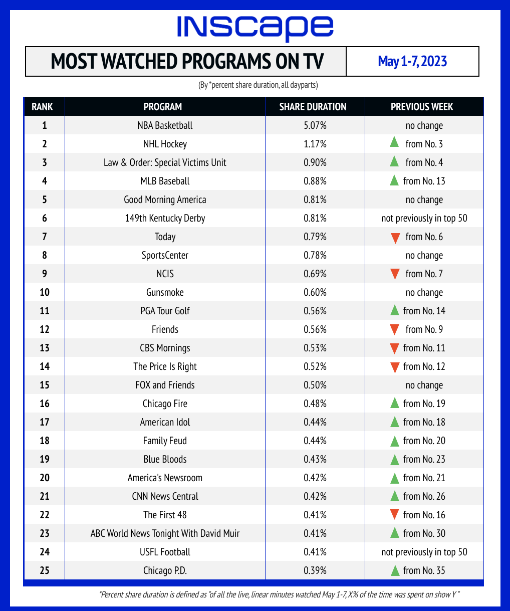 It was a big week for sports, with various leagues and related programming snagging seven of the top 25 spots in the show ranking. NBA playoff action continues to be a slam dunk, with games accounting for 5.07% of all minutes watched during the week, an increase from the previous week’s 4.50%.