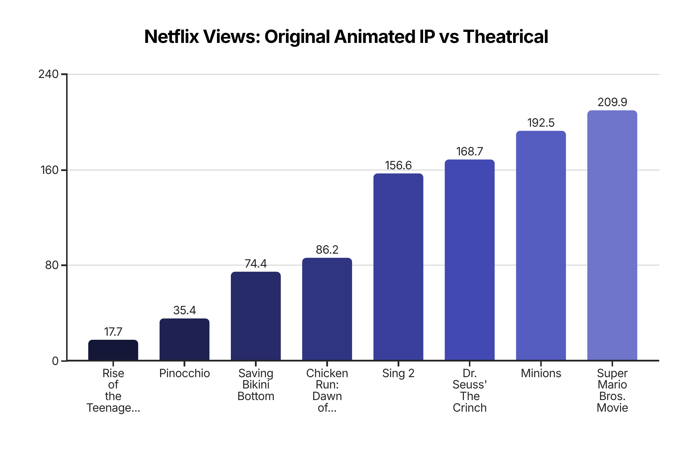 Yet IP alone doesn’t guarantee traction. Notable original animated IP misfires on Netflix from 2022-Present include Rise of the Teenage Mutant Ninja Turtles: The Movie (17.7 million global “views,” according to Netflix’s self-reported data), Guillermo del Toro’s Pinocchio (35.4 million), Saving Bikini Bottom: The Sandy Cheeks Movie (74.4 million), and Chicken Run: Dawn of the Nugget (86.2 million). Despite brand-name IP from SpongeBob to Ninja Turtles and previously successful theatrical entries, these performances are a far fry from The Super Mario Bros. Movie (209.9 million), Minions (192.5 million) and even Sing 2 (156.6 million).