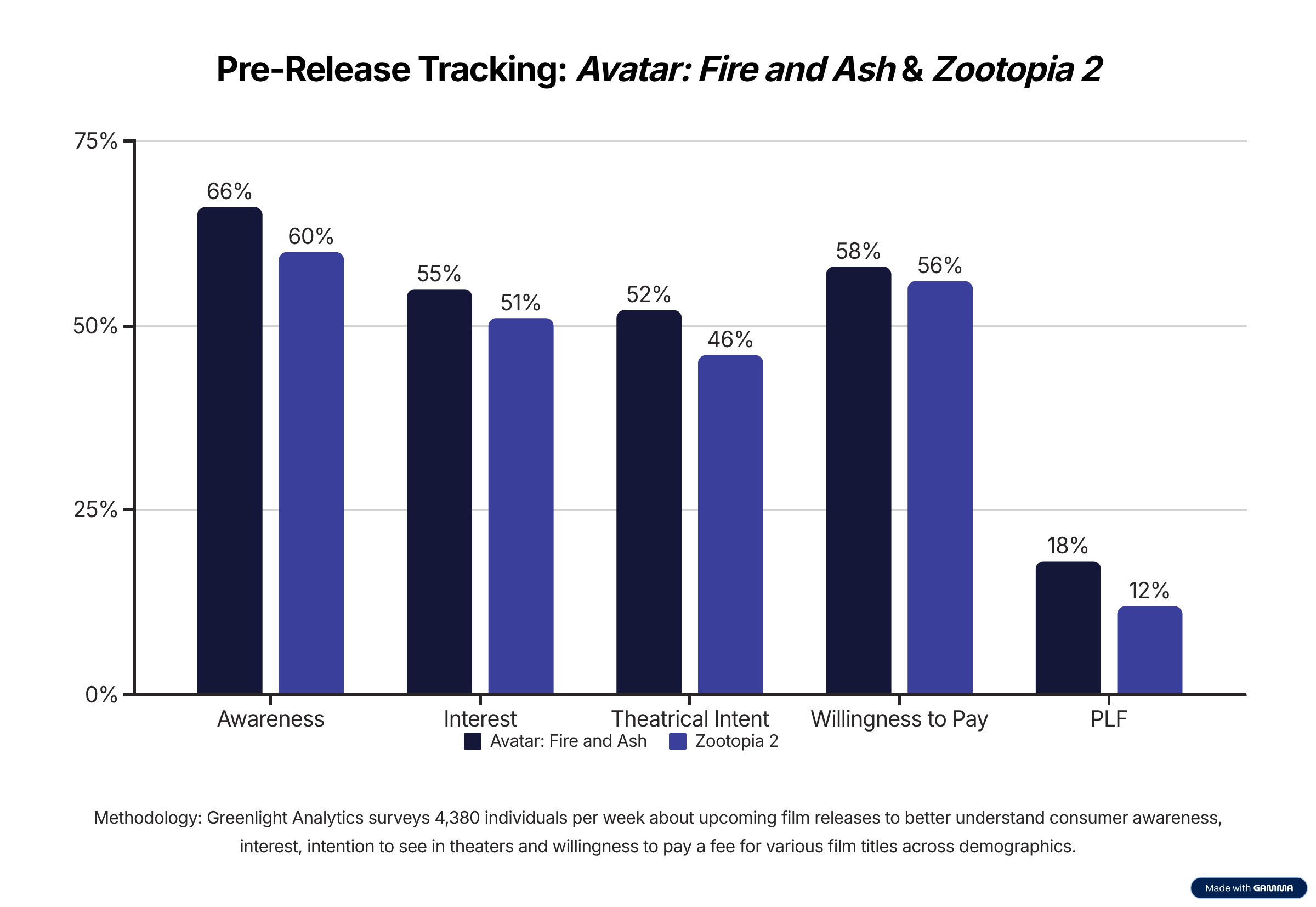 Despite this new reality, it appears as if Disney will be the only studio adding to the $1 billion club throughout the rest of 2025—and that’s bad news for rival studios dealing with their own theatrical complications. (Shout out to Warner Bros. for a diverse year of hits across genres and budget ranges). Disney’s Avatar: Fire and Ash and Zootopia 2 are demonstrating exceptional film tracking performance among unreleased movies this year, according to Greenlight Analytics. Avatar claims the top position in four out of five key metrics—Interest, Theatrical Intent, Willingness to Pay, and Premium Large Format (PLF)—while ranking 2nd in Awareness. Zootopia 2 consistently holds strong second-place positions across Interest, Theatrical Intent, and Willingness to Pay, ranks 3rd in Awareness, and places 5th in PLF intentions. These strong ranks are especially impressive given how far out each film’s release is: Zootopia 2 won’t open until late November while Avatar hits theaters one month later.