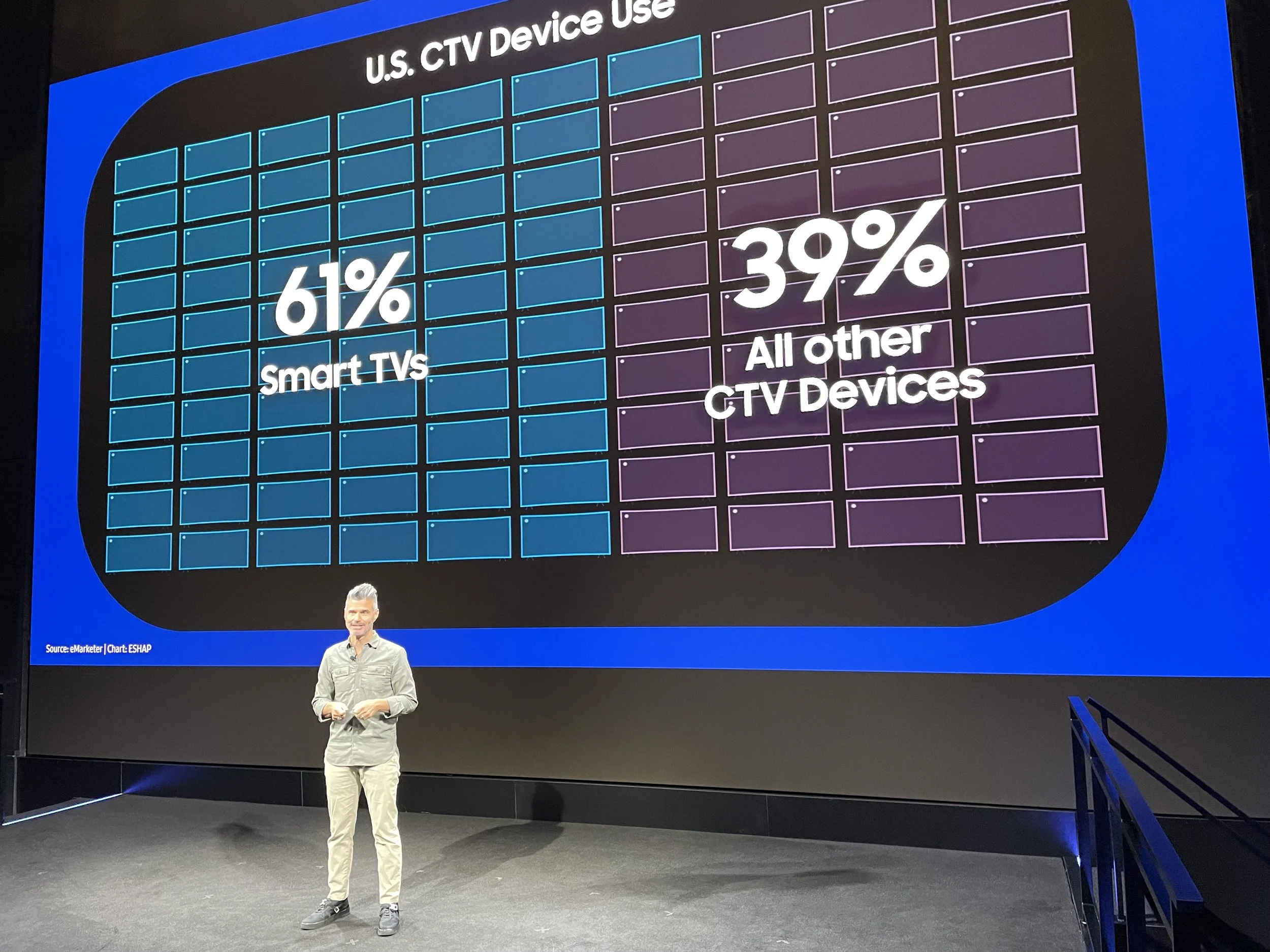 SAMSUNG held its NewFront at the Samsung Store in the Meatpacking District. Media Cartographer and TVREV friend Evan Shapiro kicked things off with a rundown of this infographic explaining why CTV is so important for advertisers as it is now dominating viewing patterns and why improved interfaces on CTV meant the dongle was dying.