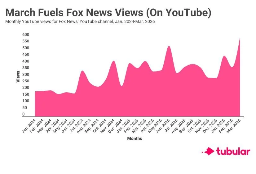 In March, Fox News hit nearly 600 million views on YouTube — the network’s largest total since at least mid-way through 2023, as it continued covering an eventful Q1 culminating in its wall-to-wall coverage of the war in Iran.