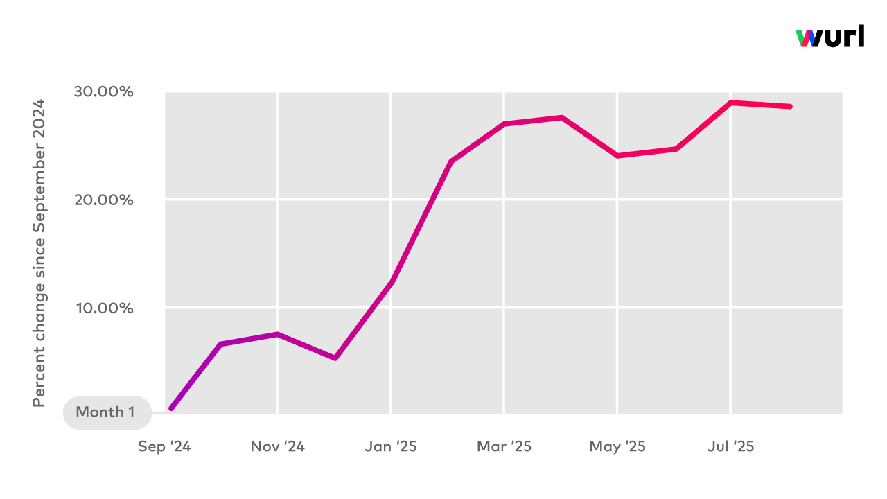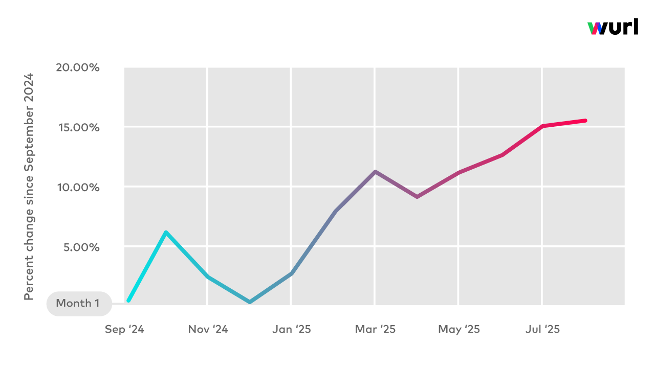 In many cases, we present normalized data to avoid disclosing sensitive commercial information. Normalized data sets one data point, usually the earliest, to the value of 0 — all the other data points are then scaled to this reference point. For instance, September 2024 is set as a baseline value of 0, and subsequent months are expressed as a percent change relative to that. This allows us to show clear directional trends without revealing absolute numbers from partners.