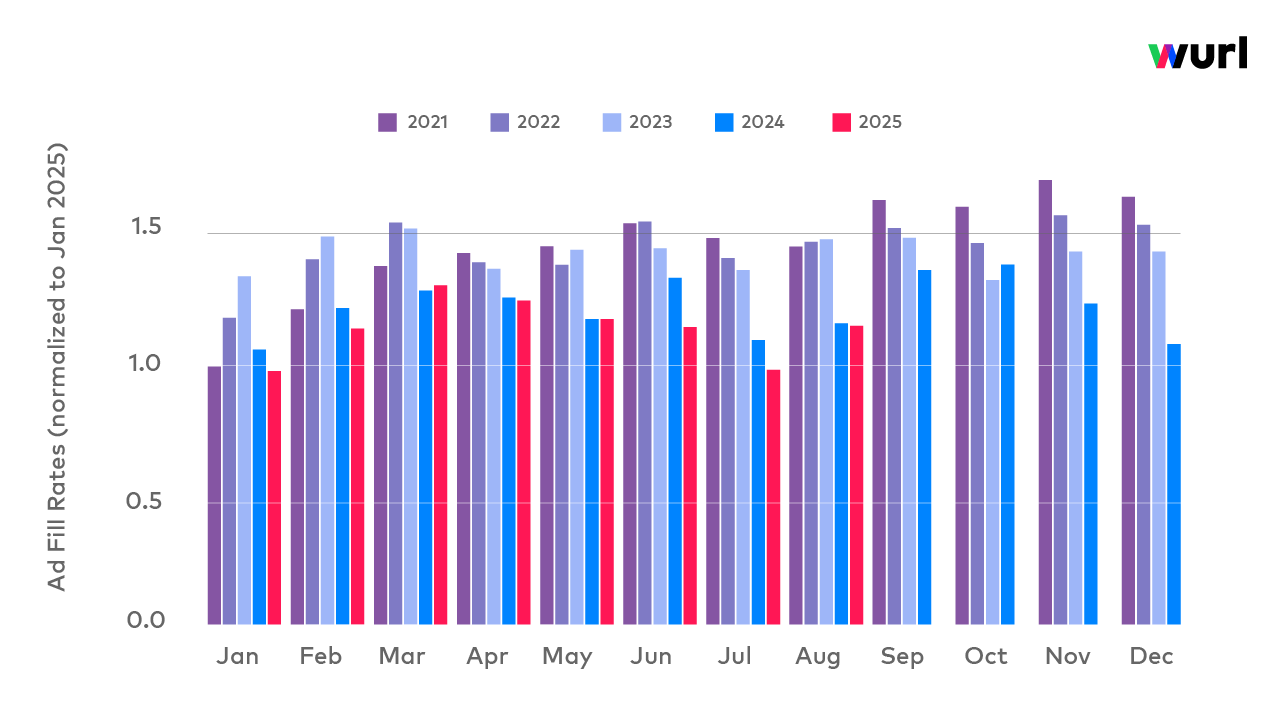 A closer look at the data reveals a consistent seasonal pattern: every quarter starts off with lower fill rates than the quarter before, with January regularly representing the lowest point of the year. The annual trends mirror budget seasonality, where advertiser spend ramps up toward the end of quarters as well as in the later months of the year as the winter holidays approach. Interestingly, October 2024 was a standout month, with fill rates briefly spiking ahead of the U.S. national elections—but even that uptick didn’t reach the highs seen in earlier years.